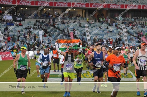 Though all major hills and 6 cutoff points I crossed well within limit , still there were many inclines and flyovers in the last 15K. Now my moral was high enough to handle it. Finally when I saw Moses Mabhida stadium from last 2K, I realized that the goal is not too far away. Just before entering the stadium I threw away the water bottle and took our Indian national flag in hand, and was running with joy for the remaining 300 mtrs!